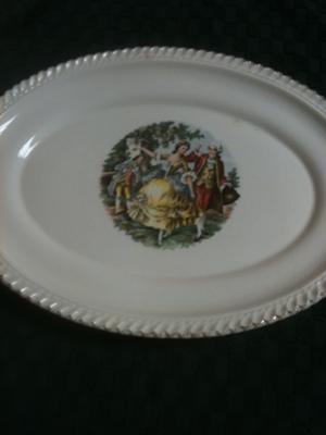 I own two 12" oval platters with a swirled, gold-trimmed border, depicting two men & a woman in 18th century dress. The marks on the backs appears to say The Marcher Pottery Company, Quality Made in the USA since 1848. The marks are faded, so that's my best guess on the name of the pottery manufacturer & how long ago it was founded. Can you help me identify these & tell me how old they might be? Thanks so much!