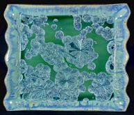 The glaze crystals are literally three dimensional, much like holograms. They develop auroras, growth rings, halos, and starbursts through changing conditions in the kiln. Chance plays a great part in crystalline-glazed works. The artists of this work don’t always know what they will have until the work is removed from the kiln. This pottery art form is a must see. Pictures do not do it justice. You will know what I mean when you see it!!!
