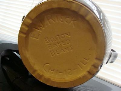 I have a 'Boston Baked Beans' pot with 'E.W. Rieck Chi-12-Ill' embossed on the bottom. The round pot is solid dark brown glaze has 2 handles about an inch from the top rim.