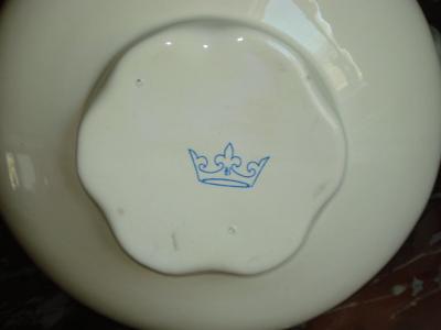 I have a wash basin and matching pitcher that I am unable to identify. The confusion is that I have seen one ALMOST identical to it by Athena California ... the Victorian Rose pattern is the same and the pitcher and bowls look the same. The differences are in the placement of the rose decorations and the makers mark. Athena pottery is easily identifiable. I have searched and searched and cannot find the mark I have. As you will see in the photo attached, it's a fleur de lis crown that has a letter B on it. I'm wondering if it's a very early Athena or made by someone else? At first glance, it certainly looks like the Athena set, but upon closer look the roses are placed differently. Help?