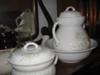 The pieces are beautiful. Each lid has a chip out of it and the tall pot has a tiny crack at the top. Otherwise in very gorgeous condition. Any help in identifying these would be greatly appreciated.