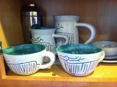 I have a set of a few pieces, two small pitchers, two mugs, a small bowl and two dishes. Most have white glaze outside and green inside and they have goats etched on them and the signature is V-J-I. I can't find anything on V-J-I but I think it is probably from the Northeast USA and circa 1950-1960.